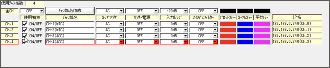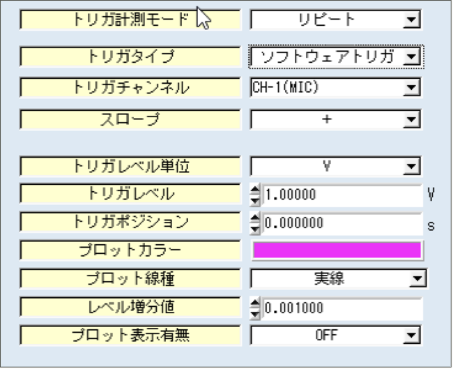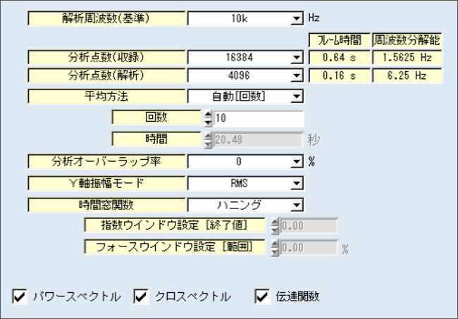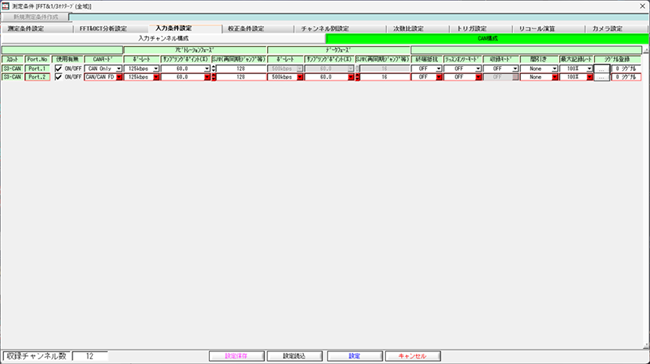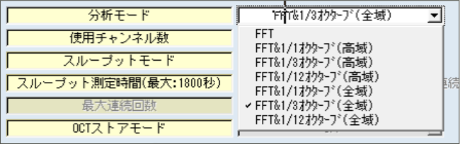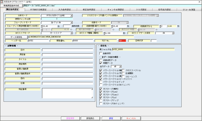 FFT&1/3オクターブ等の解析モードや入力チャンネル数や収録時間等の各種設定が可能です。