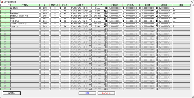 モード・ボーレート・サンプリングポイント・終端抵抗・収録モード・リッスンオンリーモード・最大記録レート・シグナルなどを設定します。